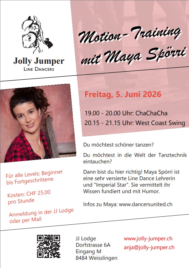 Wir freuen uns sehr, Maya Spörri am 5. Juni 2026 wieder in der Jolly Jumper Lodge begrüssen zu können. Diesmal wird uns Maya in die Welt des Cha Cha Cha und des West Coast Swings entführen. Die Workshops sind offen für alle Interessierten. Egal, ob du schon ein versierter "Techniker" bist oder ob du dich das erste Mal mit der richtigen Tanztechnik befasst - komm vorbei und lasse dich auf das kurzweilige und lehrreiche Training ein. Alle können profitieren.